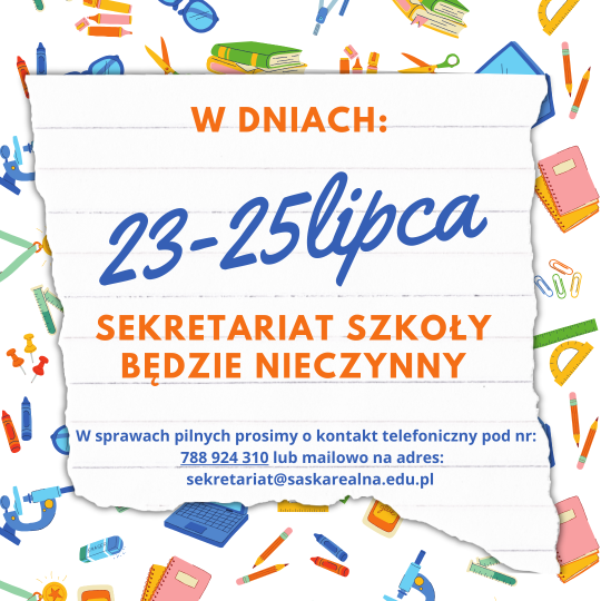 Uprzejmie informujemy,że w dniach 23-25 lipca sekretariat Saskiej Szkoły Realnej Będzie nieczynny.