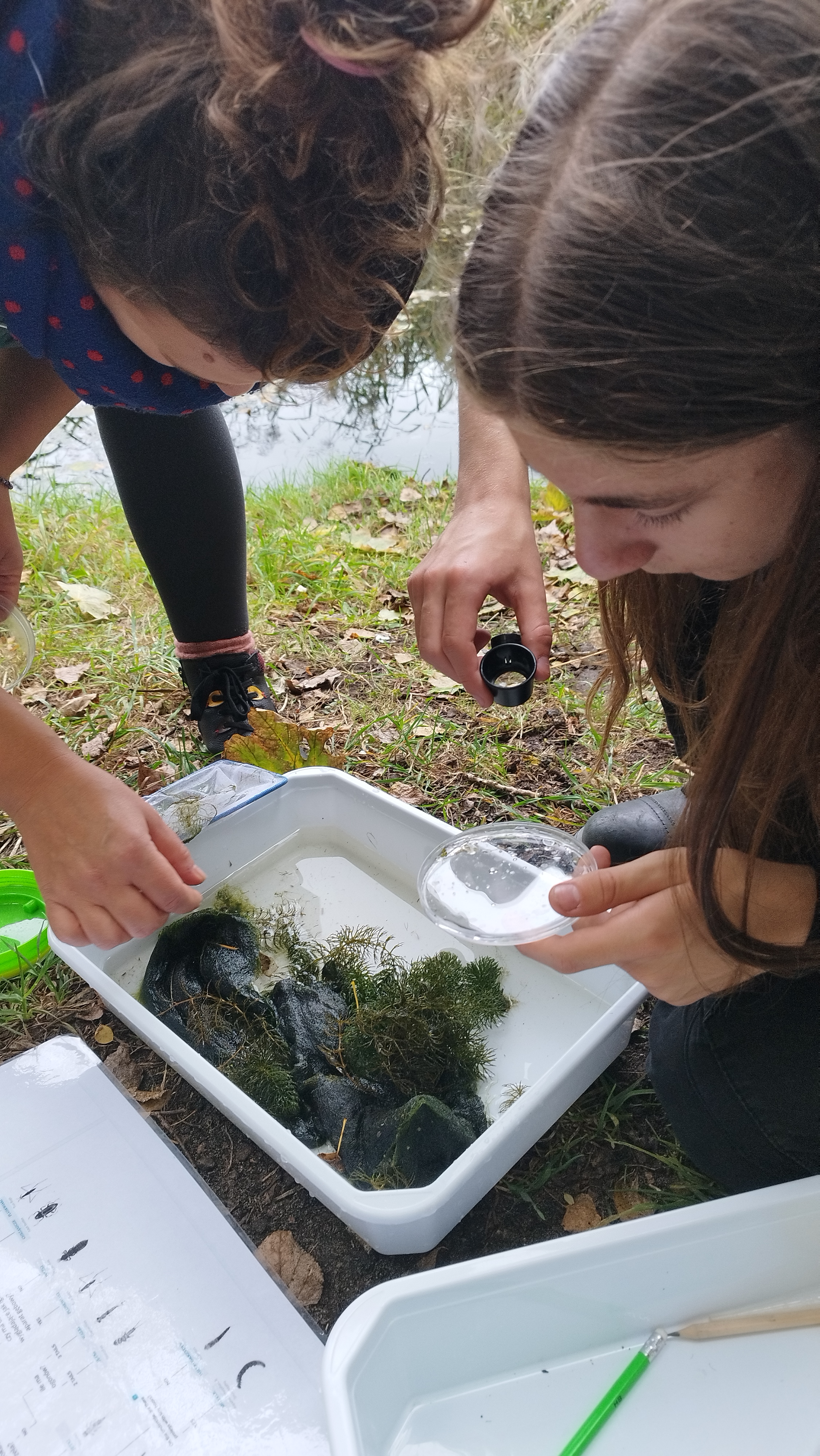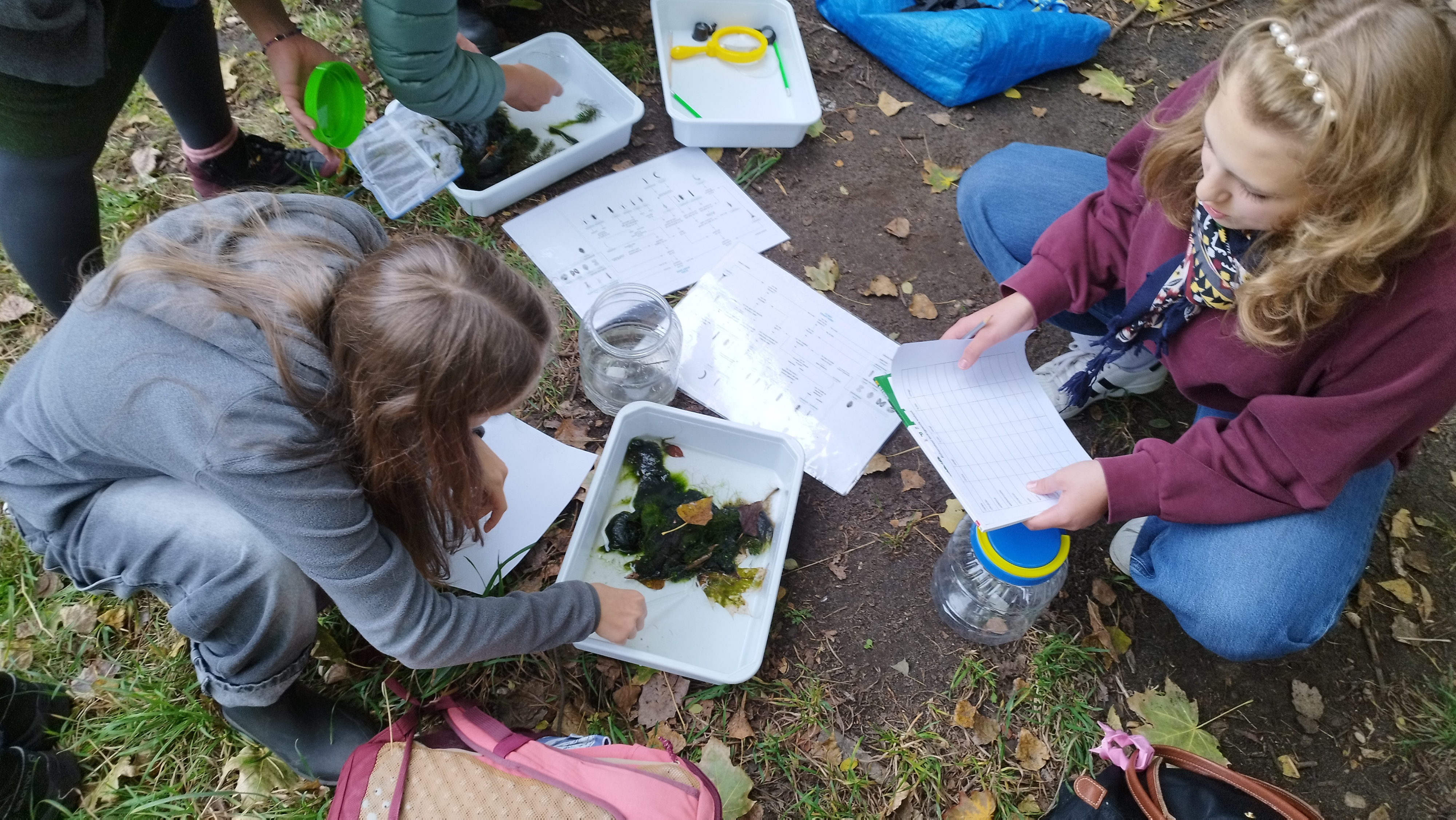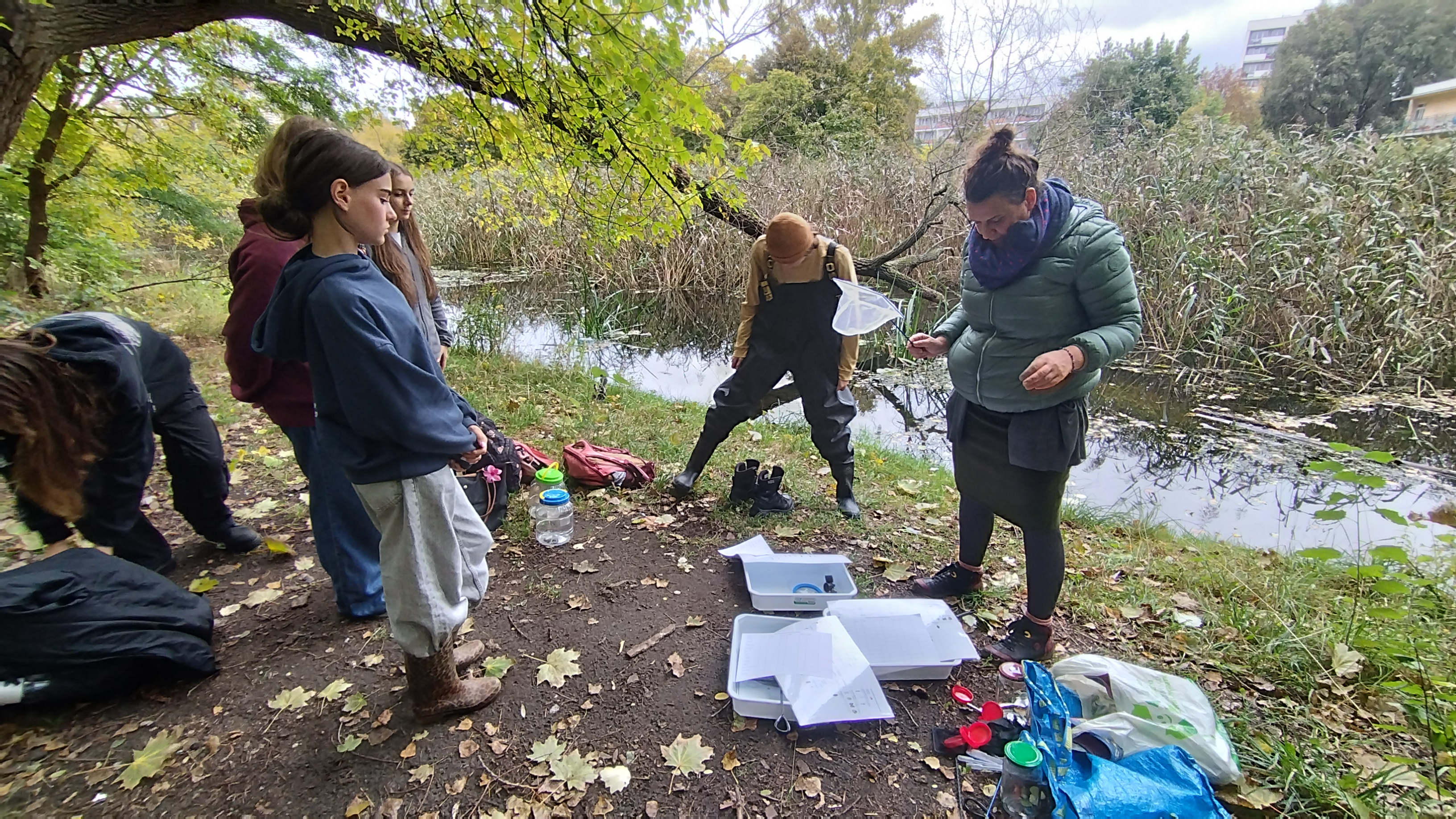Na zdjęciach widać uczniów łowiących, a następnie identyfikujących bezkręgowce żyjące w trzech zbiornikach o różnej charakterystyce. Celem było porównanie składu gatunkowego tych zbiorników.