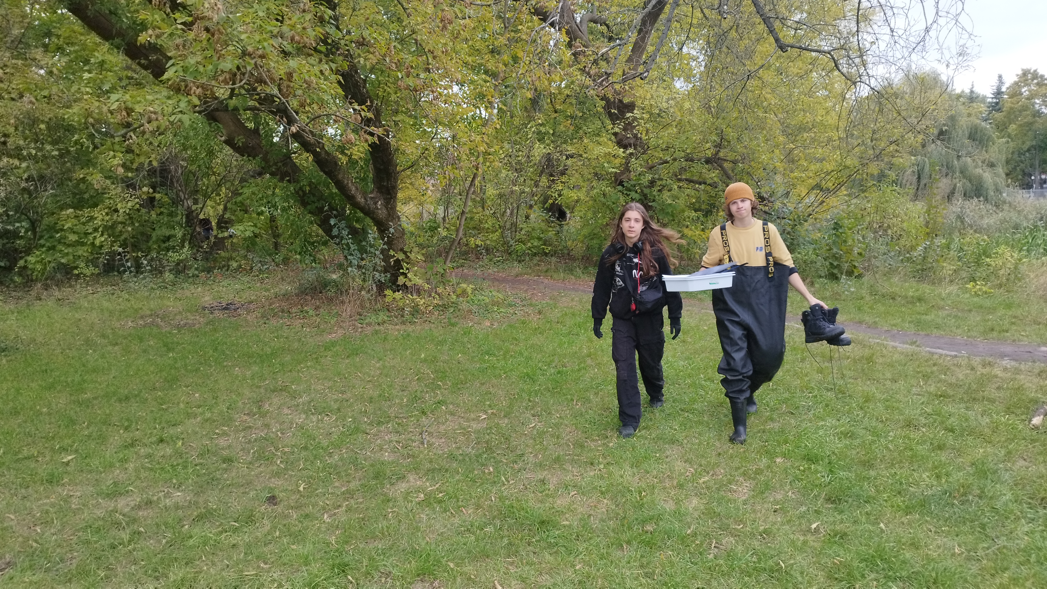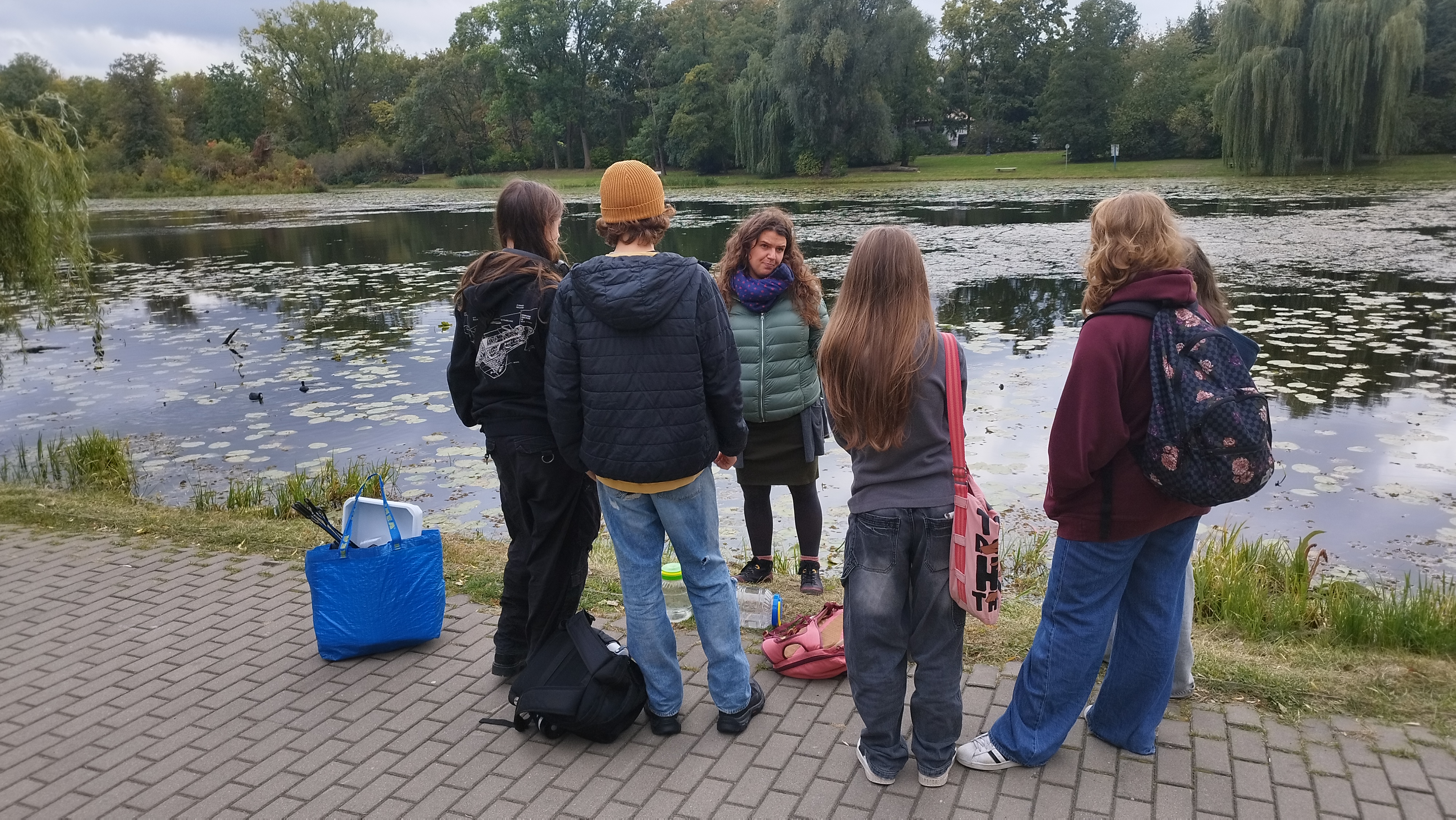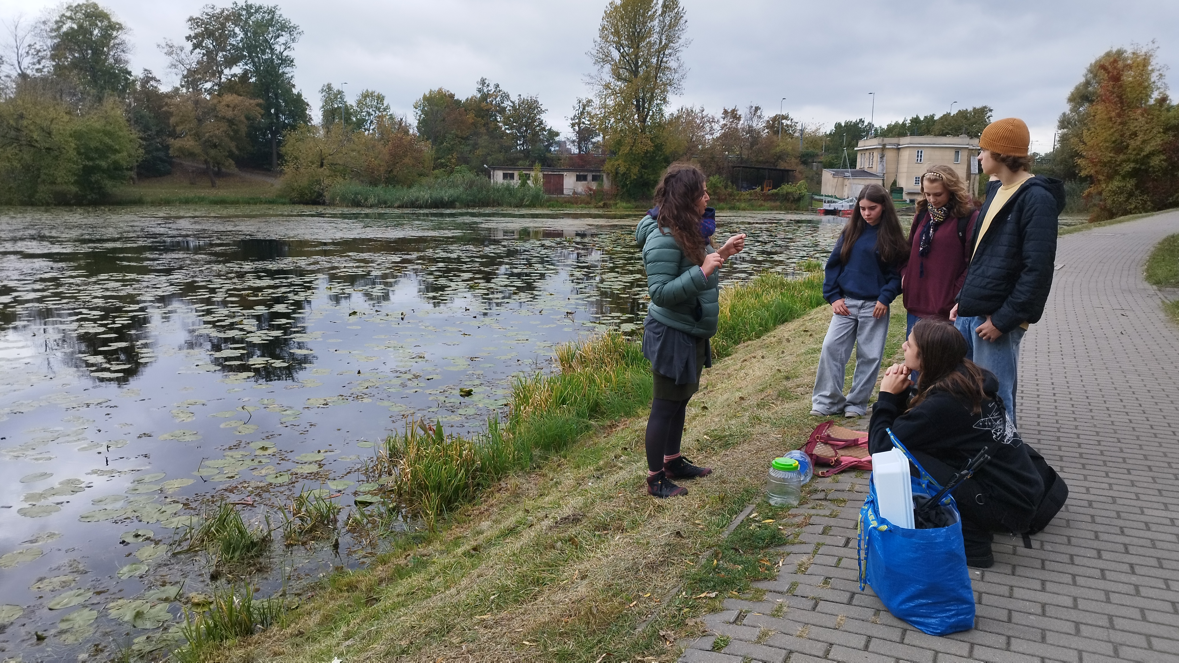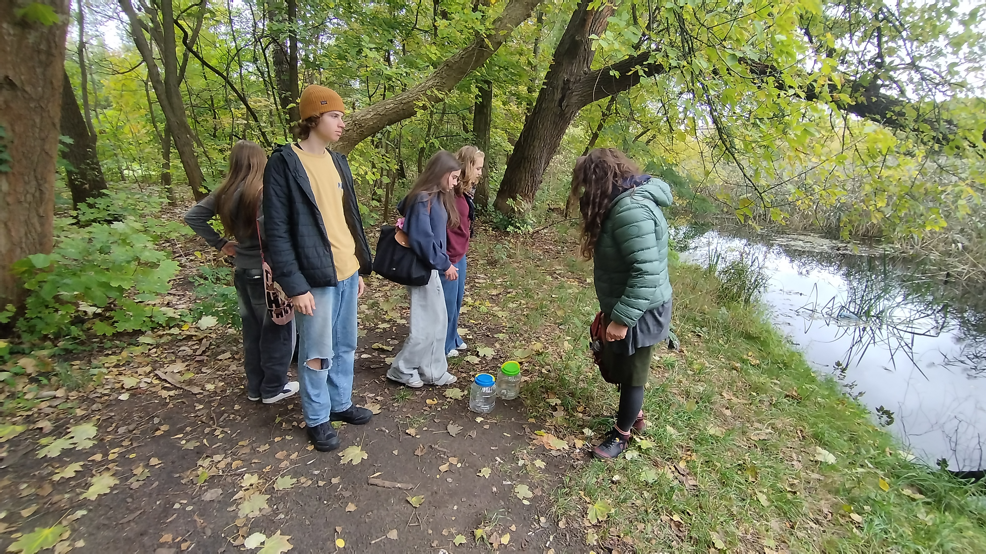 Na zdjęciach widać uczniów łowiących, a następnie identyfikujących bezkręgowce żyjące w trzech zbiornikach o różnej charakterystyce. Celem było porównanie składu gatunkowego tych zbiorników.