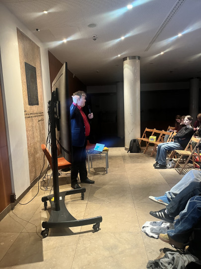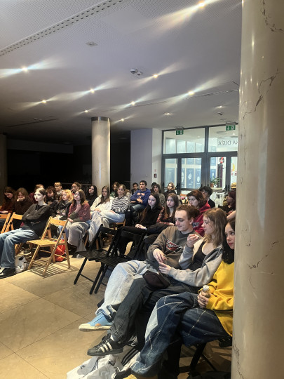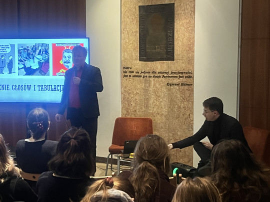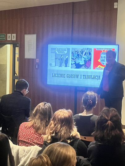 Była cześć wykładowa - tu Adam Sauer wyjaśniał znaczenie powszechności, tajności, równości, bezpośredniości i proporcjonalności wyborów. Była również część praktyczna - tu przedstawialiśmy różne zachowania wyborców i komisji przed urną wyborczą. Mieliśmy świetną okazję do rozmowy o tym, jak wybory mogą być fałszowane. I o tym, jak być świadomym wyborcą, członkiem komisji czy obserwatorem. Wiemy, wiemy - uczniowie i uczennice Saskiej Szkoły Realnej nie mają jeszcze praw wyborczych. Ale świadomość obywatelska to prawo naszych uczniów i uczennic. Adam Sauer, dziękujemy za spotkanie