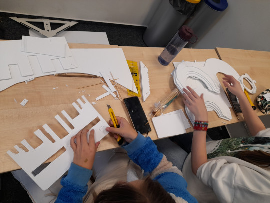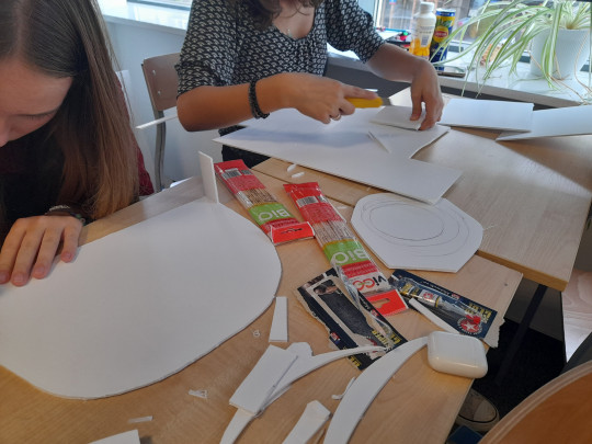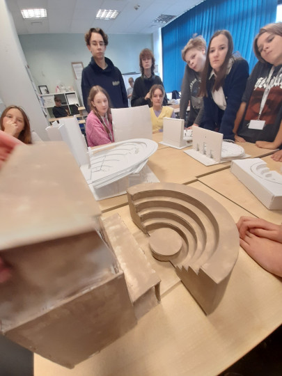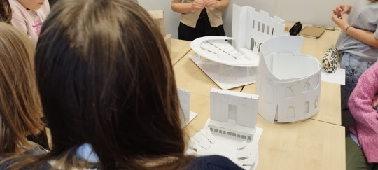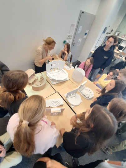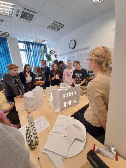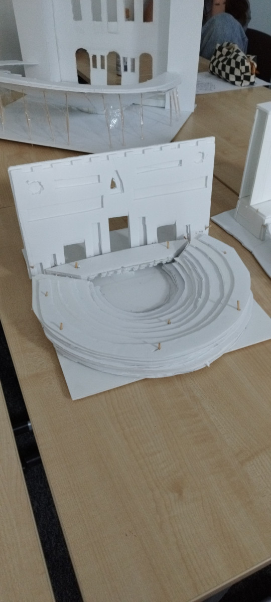 Uczennice i uczniowie klas pierwszych w ramach wstępu do specializacji poznali genezę powstania teatru antycznego, sposób wystawiania pierwszych spektakli a rozwój od strony architektury teatru mieli okazję przeanalizować tworząć własne modele teatru greckiego.
